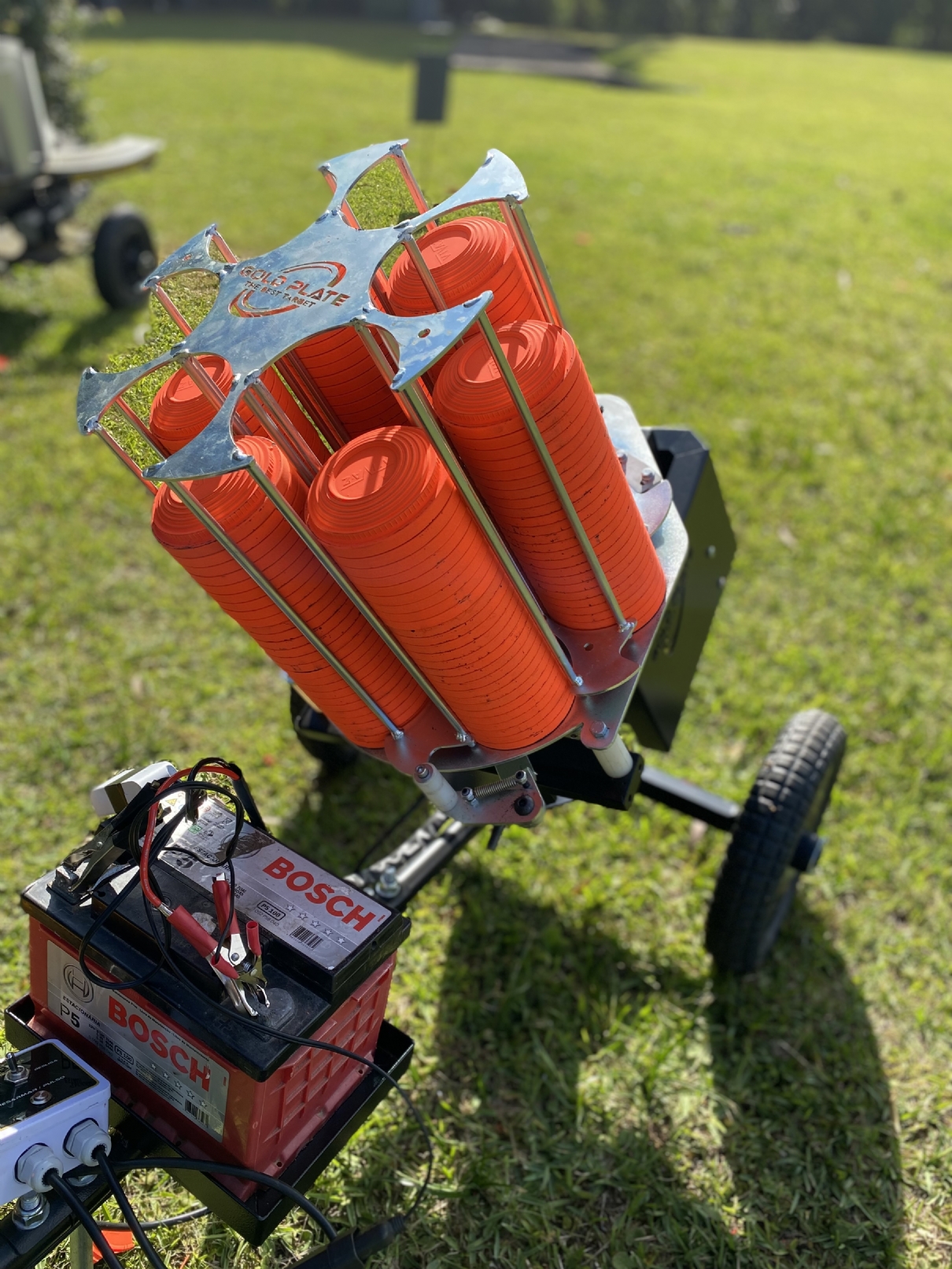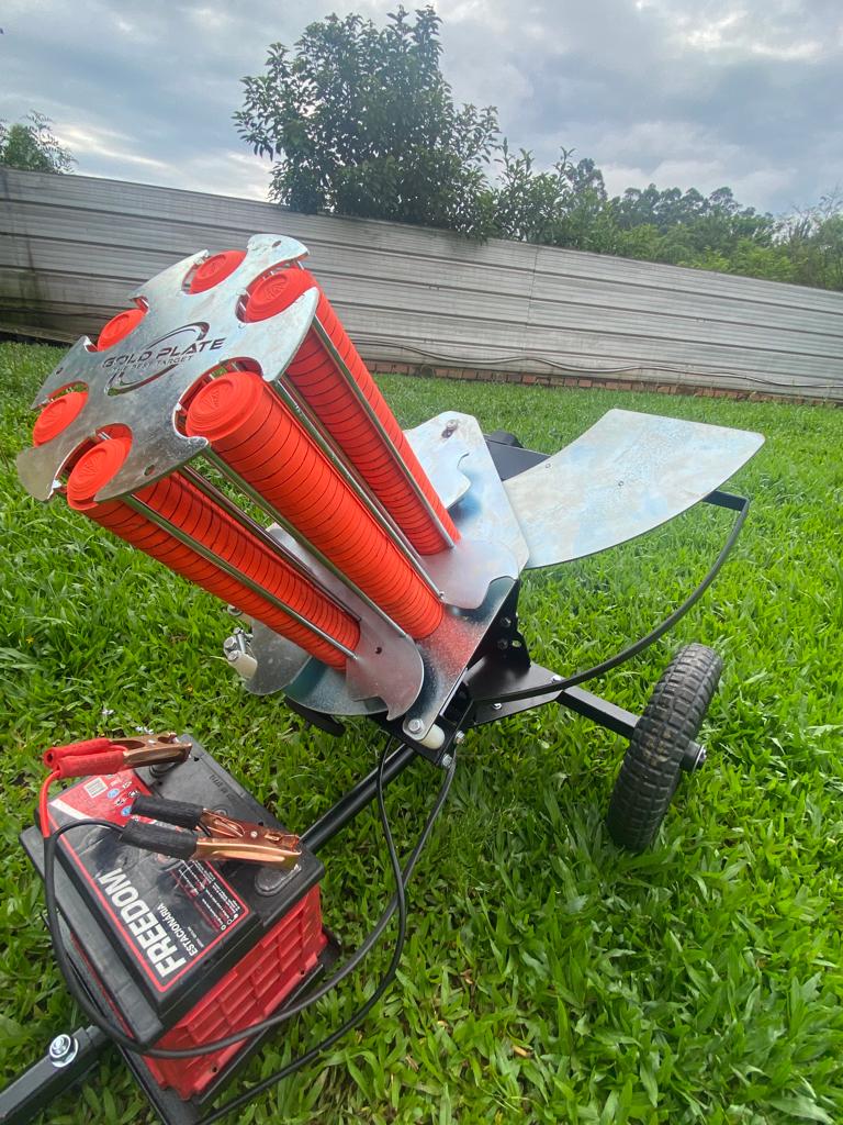 Acompanha cabo de lançamento com 30mts com disparador por botão, carrinho para transporte com rodas de pneu maciço e flexível e alimentação 12V por bateria (não inclusa).