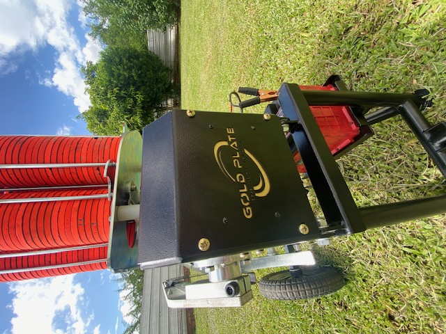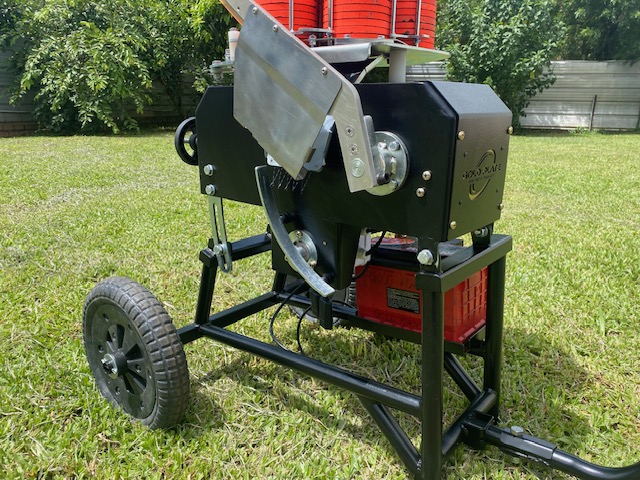 Acompanha cabo de lançamento com 30mts com disparador por botão, carrinho para transporte com rodas de pneu maciço e flexível e alimentação 12V por bateria (não inclusa).
